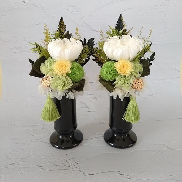 グリーンもすべてプリザーブドフラワーなので高貴な印象の佇まいでお仏壇にも飾りやすい仏花です。