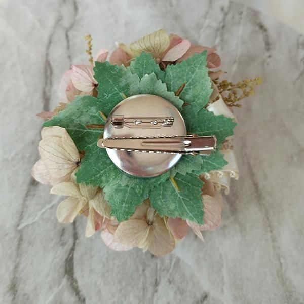 ●使用花材 プリザーブドフラワー(ローズ・アジサイ・かすみ草、ストーベ)、リボン、パール、リーフ、ダブルピン