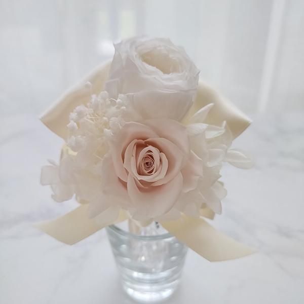●使用花材 プリザーブドフラワーローズ(白、スノーピンク)、プリザーブド(あじさい、かすみ草ミリオンスター)