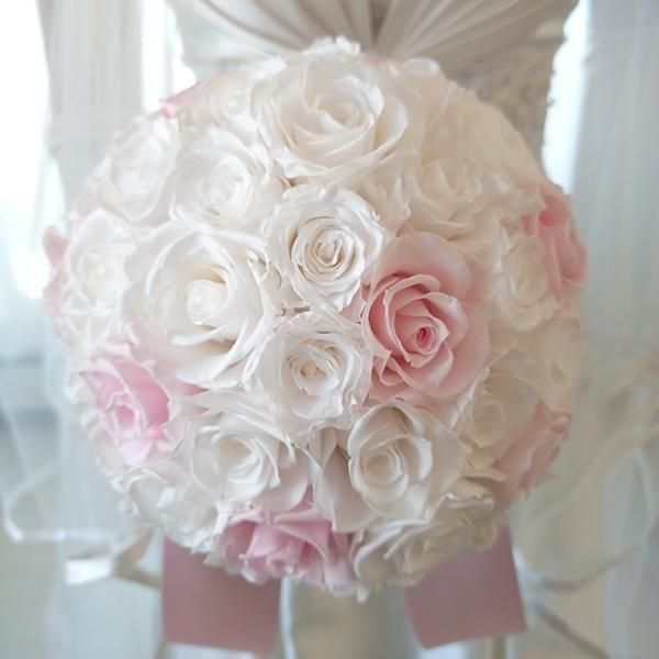 ふんわりとした純白のローズに、やさしいペールピンクを添えた、永遠の愛を象徴するラウンドブーケです。